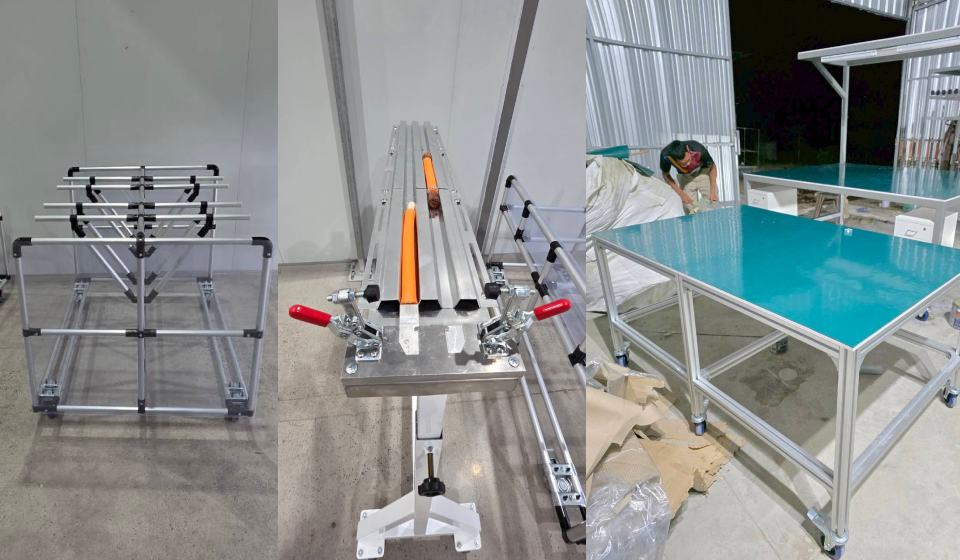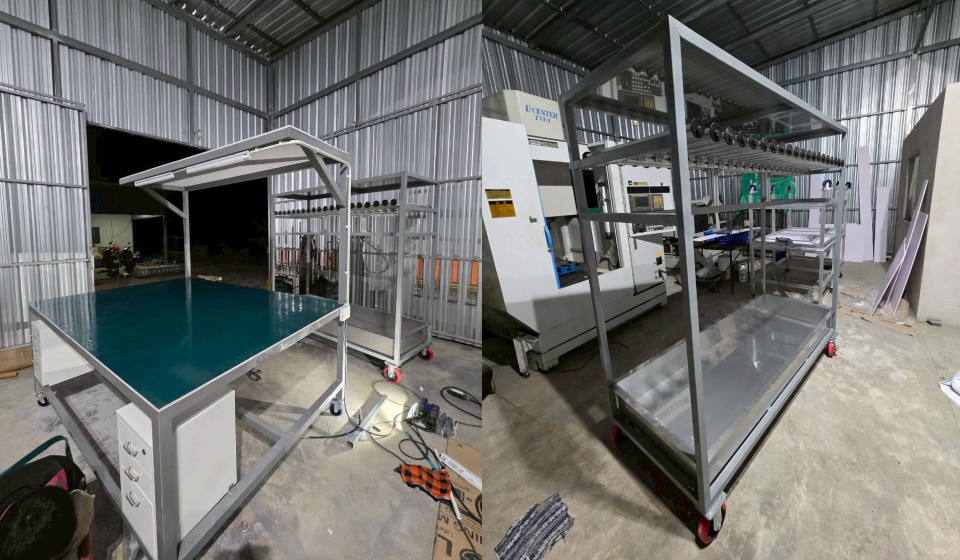 งานผลิตรถเข็นที่ใช้ในไลน์ผลิต โครงสร้างสามารถรับน้ำหนังได้ 100 kg และปูพื้นโต๊ะด้วยแผ่นป้องกันไฟฟ้าสถิต ( ESD )